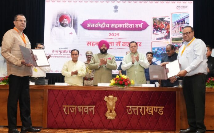 राजभवन देहरादून – राज्यपाल लेफ्टिनेंट जनरल गुरमीत सिंह (से नि) एवं मुख्यमंत्री पुष्कर सिंह धामी ने बुधवार को राजभवन में अंतर्राष्ट्रीय सहकारिता वर्ष-2025 के उपलक्ष्य पर आयोजित ‘सहकारिता में सहकार’ कार्यक्रम में प्रतिभाग किया। इस अवसर पर राज्यपाल और मुख्यमंत्री की उपस्थिति में भारतीय सहकारी समिति लिमिटेड और उत्तराखण्ड राज्य सहकारी संघ के मध्य समझौता ज्ञापन हुआ। इस समझौते ज्ञापन के माध्यम से न केवल बीज उत्पादन और वितरण के क्षेत्र में नई संभावनाएं खुलेंगी बल्कि राज्य सहकारी समितियों और किसानों के लिए भी एक मील का पत्थर साबित होगा। दूसरा समझौता ज्ञापन राष्ट्रीय सहकारी निर्यात समिति और उत्तराखण्ड राज्य सहकारी संघ के बीच हुआ जो राज्य के कृषि उत्पादकों सहकारी समितियों और किसानों को राष्ट्रीय एवं अंतर्राष्ट्रीय बाजारों तक पहुंचाने की दिशा में महत्वपूर्ण साबित होगा।