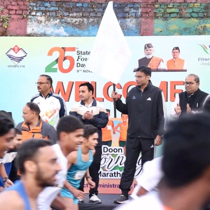 उत्तराखंड राज्य स्थापना दिवस रजत जयंती समारोह के अवसर पर दून मैराथन को डीएम सविन बंसल ने झंडी दिखाकर रवाना किया।