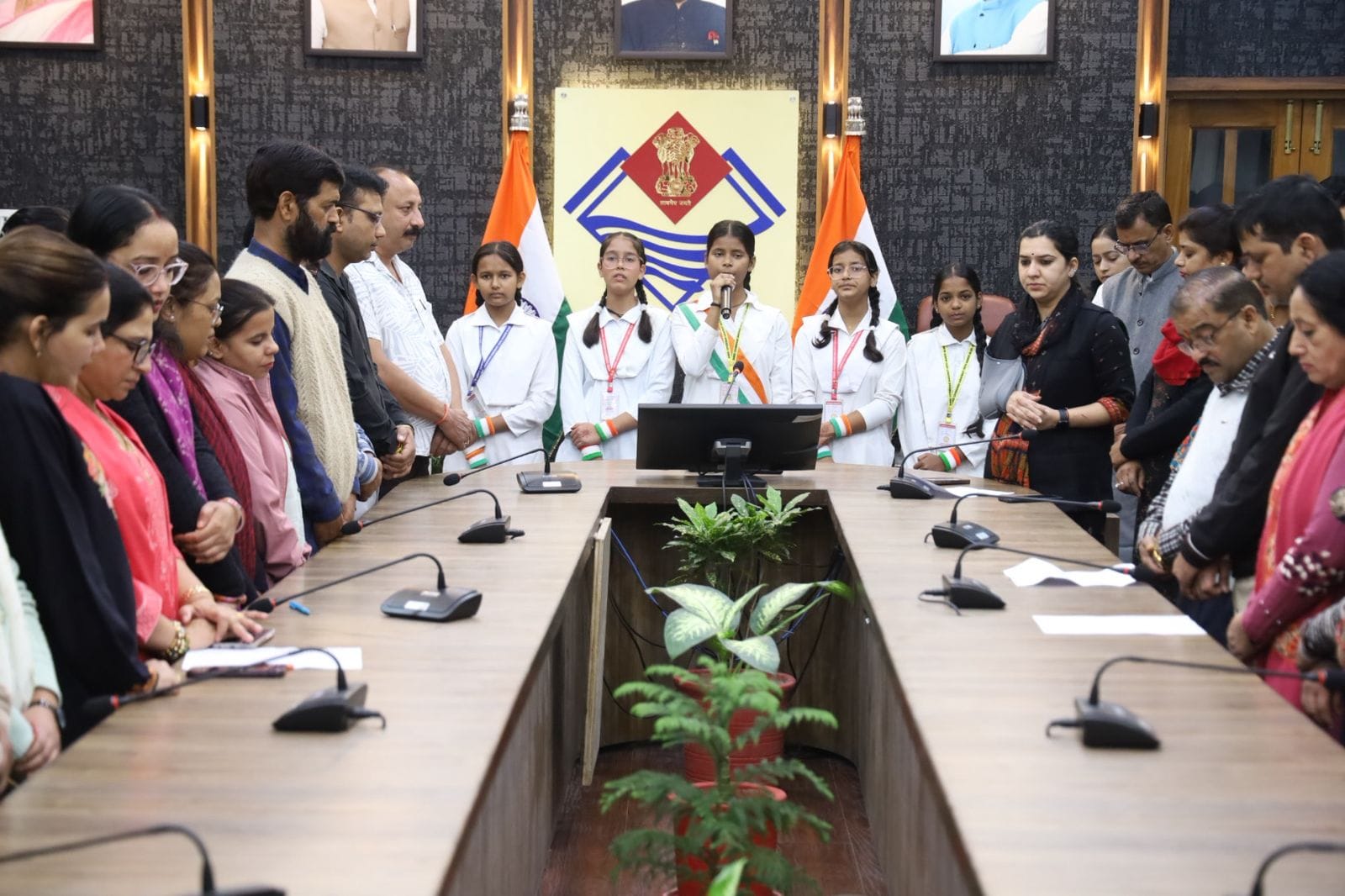 देहरादून – भारत वर्ष के राष्ट्रगीत ‘‘वंदे मातरम्’’ के 150 वर्ष पूर्ण होने के अवसर जनपद के सभी सरकारी, गैर सरकारी कार्यालयों, शिक्षण संस्थानों एवं सामाजिक संगठनों में प्रातः 10 बजे ‘‘वंदे मातरम्’’ का गायन किया गया। जिलाधिकारी सविन बंसल के दिशा निर्देशन में जिला कार्यालय में उप जिलाधिकारी अपूर्वा सिंह की मौजूदगी में क्लेक्ट्रेट परिसर के समस्त अधिकारियों, कार्मिकों एवं श्री गोर्वधन सरस्वती विद्या मंदिर की छात्राओं की उपस्थिति में वंदे मातरम् का सामूहिक गायन किया गया। इस मौके पर देशभक्ति से ओत-प्रोत वातावरण में अधिकारीगण, कार्मिक, शिक्षक, विद्यार्थी सभी उत्साहपूर्वक शामिल हुए।