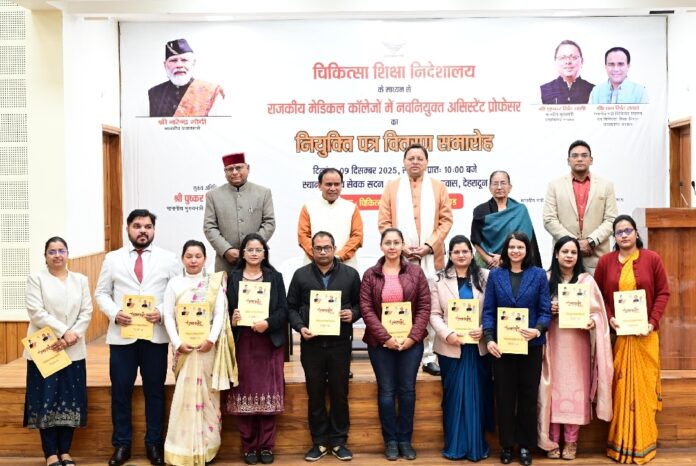 देहरादून – मुख्यमंत्री पुष्कर सिंह धामी ने मंगलवार को मुख्य सेवक सदन, मुख्यमंत्री आवास, देहरादून में आयोजित कार्यक्रम में प्रतिभाग करते हुए चिकित्सा सेवा चयन बोर्ड के माध्यम से चयनित राजकीय मेडिकल कॉलेजों में 142 असिस्टेंट प्रोफेसर्स को नियुक्ति पत्र वितरित किए।