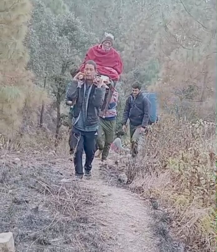 ग्रामीणों को कड़ी मशक्कत करनी पड़ी एवं कुर्सी पर डंडों के सहारे पालकी बना करके उनको सड़क मार्ग तक पहुंचाया गया ग्रामीणों का कहना है कि या मिली है कि गांव के लिए 2016 में मुख्यमंत्री घोषणा के अंतर्गत 8 किलोमीटर सड़क स्वीकृत हुई थी लेकिन अभी तक सरकार का रवैया ढुलमुल रहा है एवं ग्रामीण सड़क से अभी भी वंचित है यदि ऐसी स्थिति रही तो गांव में बसे जो अन्य परिवार है वह भी पलायन की मार झेलेंगे और पूरा गांव खाली हो जाएगा पहाड़ों में लगभग गांव का पलायन करना मुख्य रूप से सड़क स्वास्थ्य शिक्षा एवं पेयजल की समस्याएं विभिन्न रूप से सामने को देखने को मिल रही है अतः में इन सभी जनप्रतिनिधियों से सरकार से अनुरोध करता हूं कि उक्त गांव के निवासियों की पीड़ा को समझे एवं क्षेत्रीय जनता की भावनाओं को ध्यान में रखते हुए हुए गांव तक सड़क मार्ग का अवश्य निर्माण कराया जाए ताकि गांव के लोग अपनी दुख बीमारी मैं समय पर स्वास्थ्य सुविधाओं का लाभ ले सके एवं सुख सुविधाओं के समय से वंचित न रहे