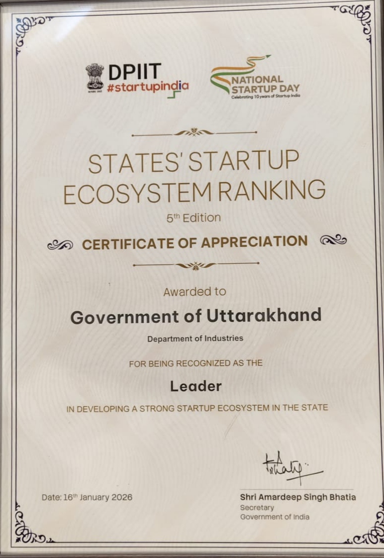 देहरादून –  भारत सरकार के वाणिज्य एवं उद्योग मंत्रालय के अंतर्गत उद्योग संवर्धन एवं आंतरिक व्यापार विभाग (DPIIT) द्वारा जारी States’ Startup Ecosystem Ranking (5वां संस्करण) में उत्तराखण्ड को मजबूत स्टार्टअप इकोसिस्टम विकसित करने में ‘लीडर’ के रूप में मान्यता प्रदान की गई है। इस उपलब्धि के लिए राष्ट्रीय स्टार्टअप दिवस के अवसर पर उत्तराखण्ड सरकार के उद्योग विभाग को Certificate of Appreciation प्रदान किया गया।