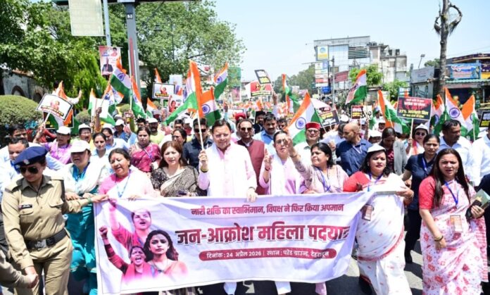 देहरादून। मुख्यमंत्री पुष्कर सिंह धामी ने शुक्रवार को परेड ग्राउण्ड, देहरादून में महिला जन आक्रोश रैली में प्रतिभाग किया। इस दौरान मुख्यमंत्री, हजारों की संख्या में मौजूद महिलाओं के साथ परेड ग्राउंड से घंटाघर तक जन आक्रोश पदयात्रा में भी शामिल हुए। मुख्यमंत्री पुष्कर सिंह धामी ने कहा कि प्रधानमंत्री नरेंद्र मोदी के नेतृत्व में मातृशक्ति को देश की लोकतांत्रिक व्यवस्था में उनका अधिकार दिलाने के लिए नारी शक्ति वंदन अधिनियम लाया गया था। परंतु लोकसभा में संख्या बल के कारण बिल पारित नहीं हो पाया। उन्होंने कहा विपक्ष ने षड्यंत्र करके नारी शक्ति का अधिकार छिनने का काम किया है। उन्होंने कहा देश की नारी, अन्याय के विरुद्ध अवश्य आवाज उठाएगी क्योंकि अब नारी अपने अधिकारों के प्रति सजग हो चुकी है।